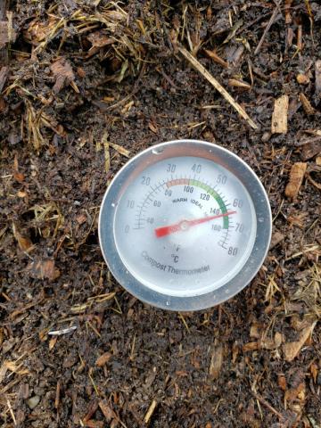However, midsummer, last year I started to mix some of the chips with grass and loose hay and that definitely resulted in the chips breaking down further than the ones that were still in the original pile. Then last week (5/2/2020) I then "turned" that pile and mixed in chicken manure, more grass clippings, and a couple other nitrogen sources. I was quite happy to see that the pile was around a balmy 148 degrees Fahrenheit this morning! I am confident that in two weeks that this pile will make a nice amendment to my Three Sisters Garden!